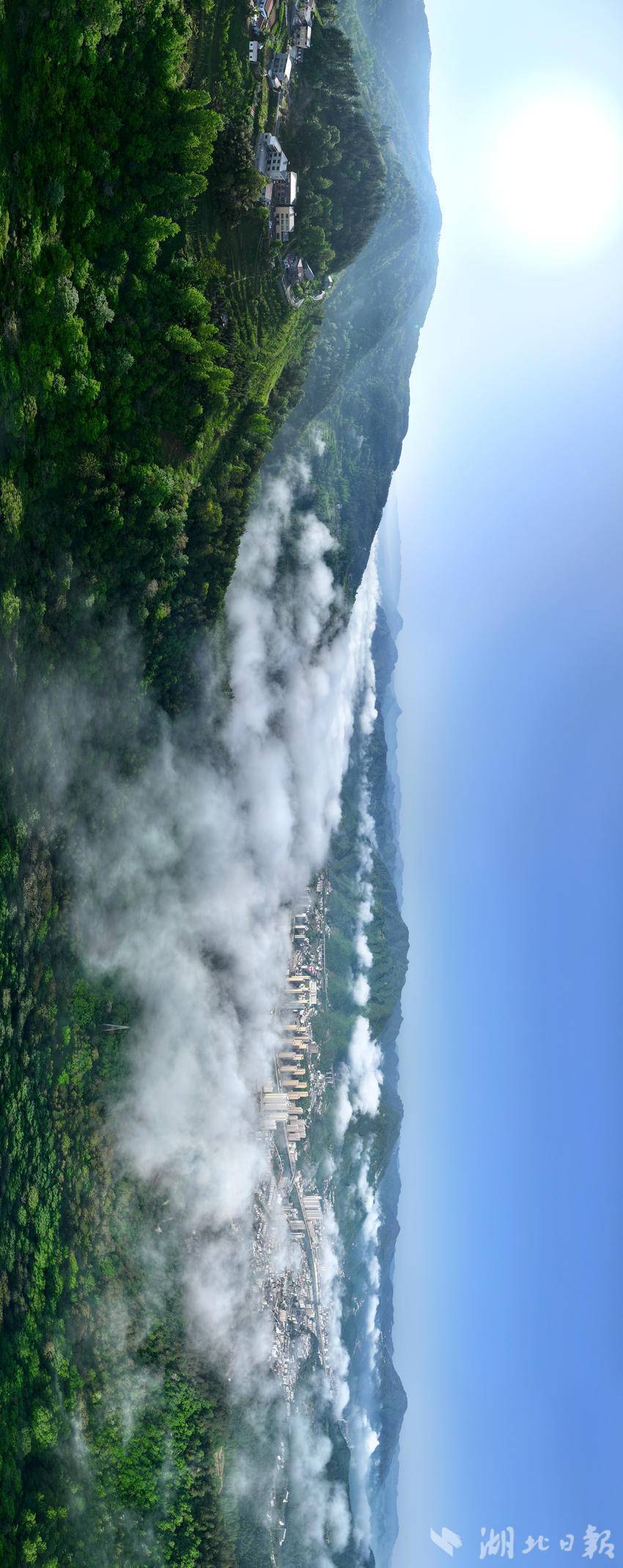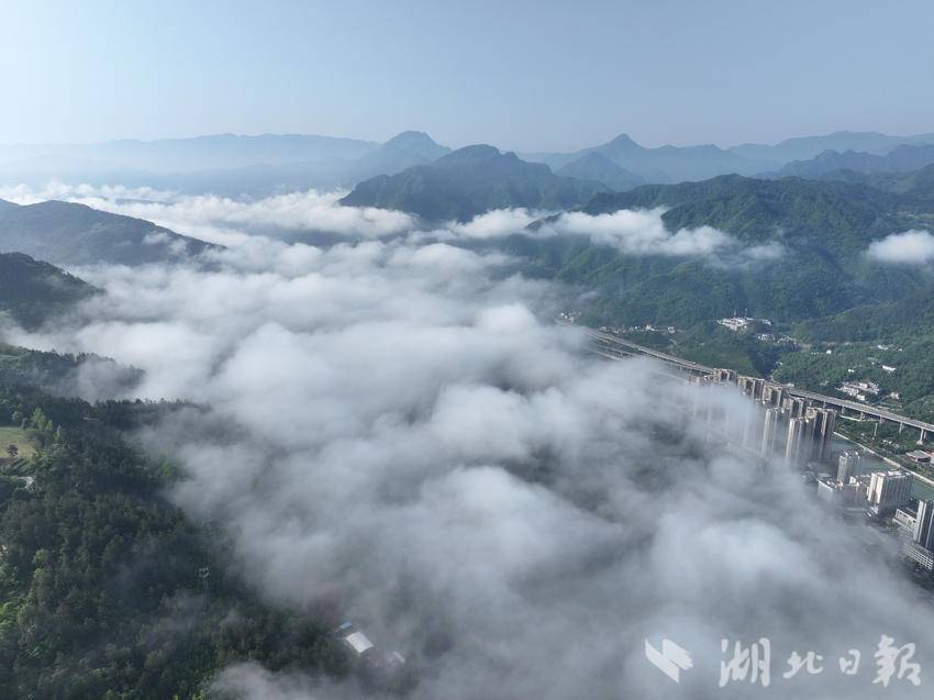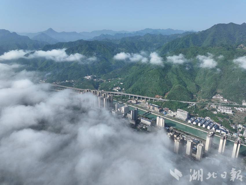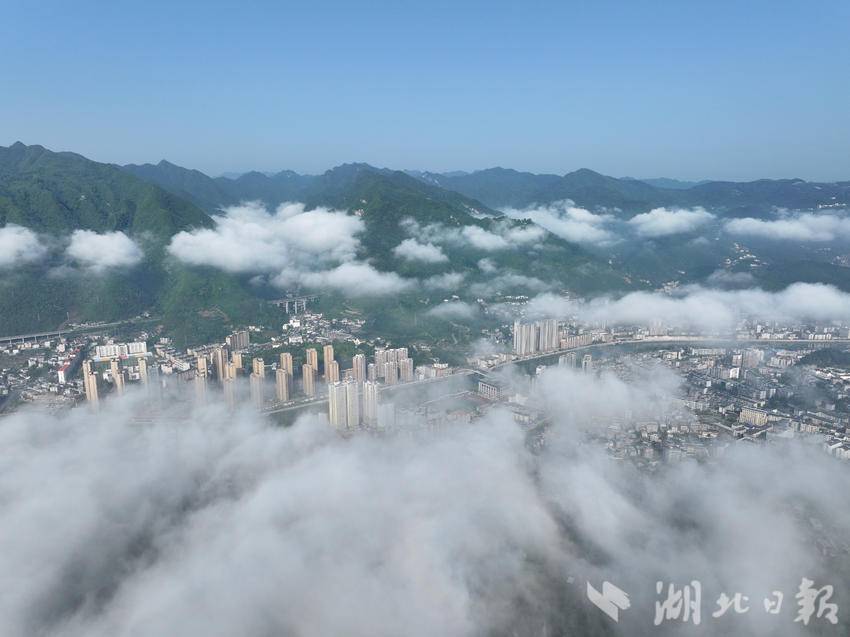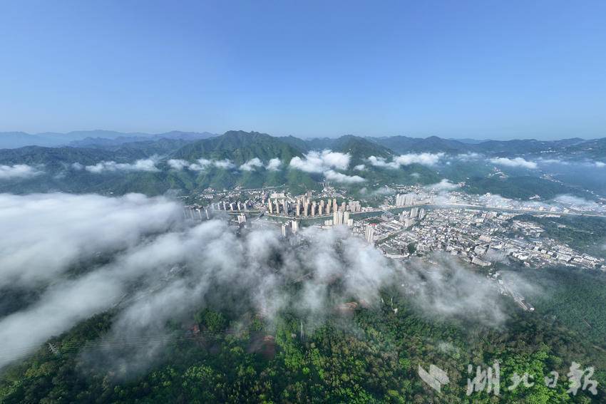 晨雾漫过荆山千峰,云海如浪,将山城轻轻托起。晴光穿透薄雾,河谷间的楼宇在云影中若隐若现,仿佛从水墨画卷中缓缓走来。