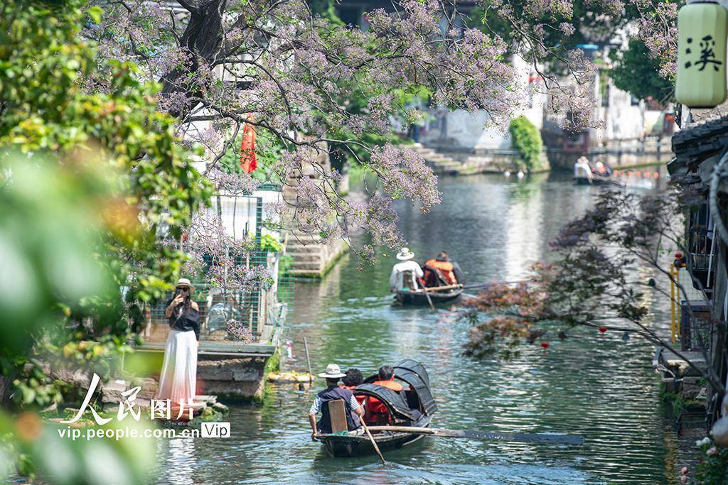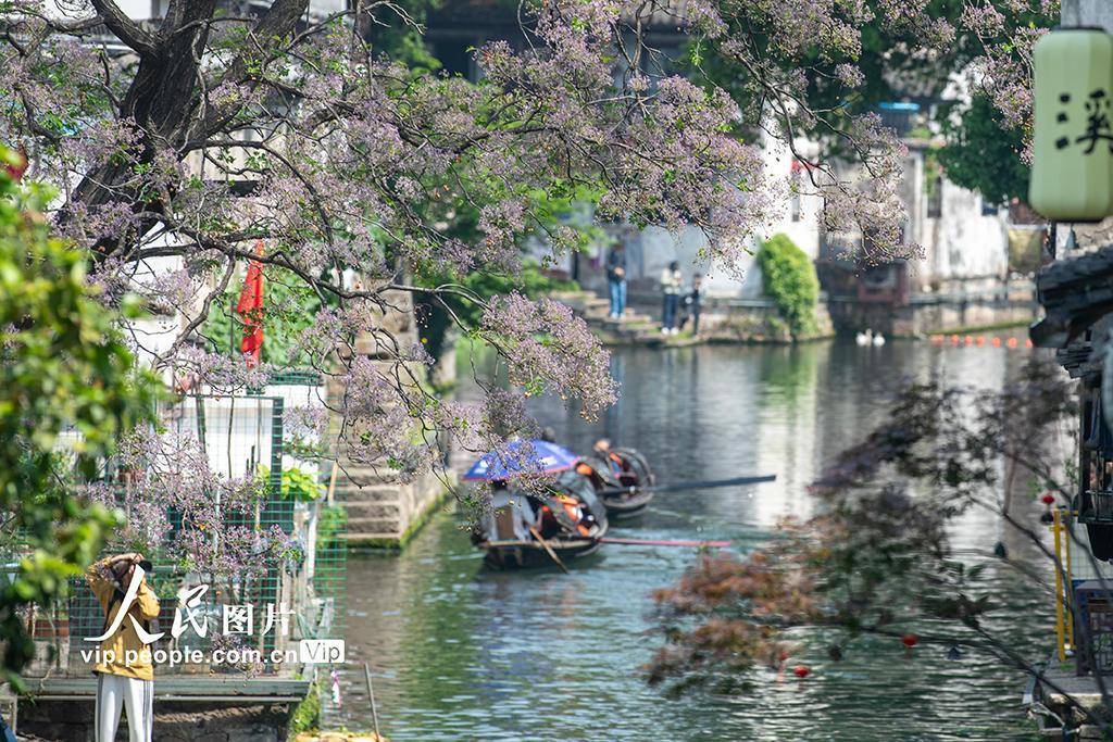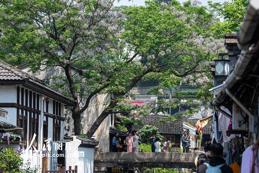 连日来,浙江绍兴越城区书圣故里、仓桥直街等地的苦楝花悄然开放,淡紫色小花与粉墙黛瓦、小桥流水相映成景,吸引众多市民游客前来赏花拍照,感受江南水乡韵味。张辉摄(人民图片网)