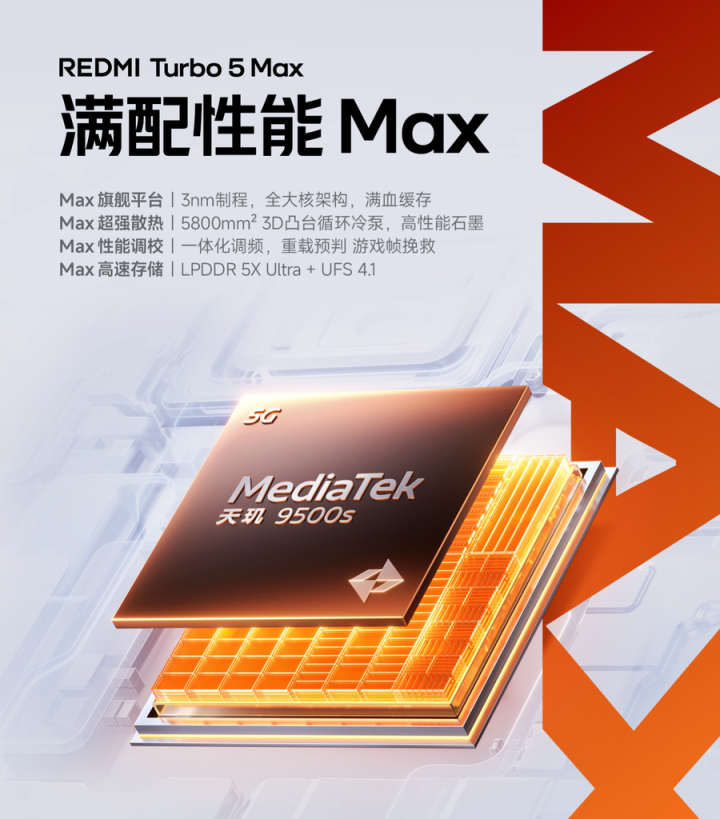 性能上的碾压式投入,是Turbo5Max叫板旗舰的底气。作为系列首款搭载天玑9000正代旗舰芯的机型,它全球首发天玑9500s,台积电3nm制程加持下,形成“1+3+4”全大核架构,安兔兔跑分直接冲到361万分。要知道同价位机型跑分多在250万分左右,即便是4000价格档位部分旗舰,也难稳超这个成绩。